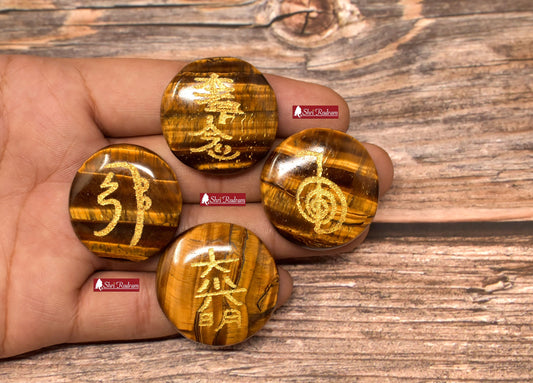 Tiger Eye Stone Set of 4 Pcs with Usui Reiki Symbols , Reiki Disc Set, Engraved Usui Reiki Symbols Disc Set, Healing Crystals, Palm Stone