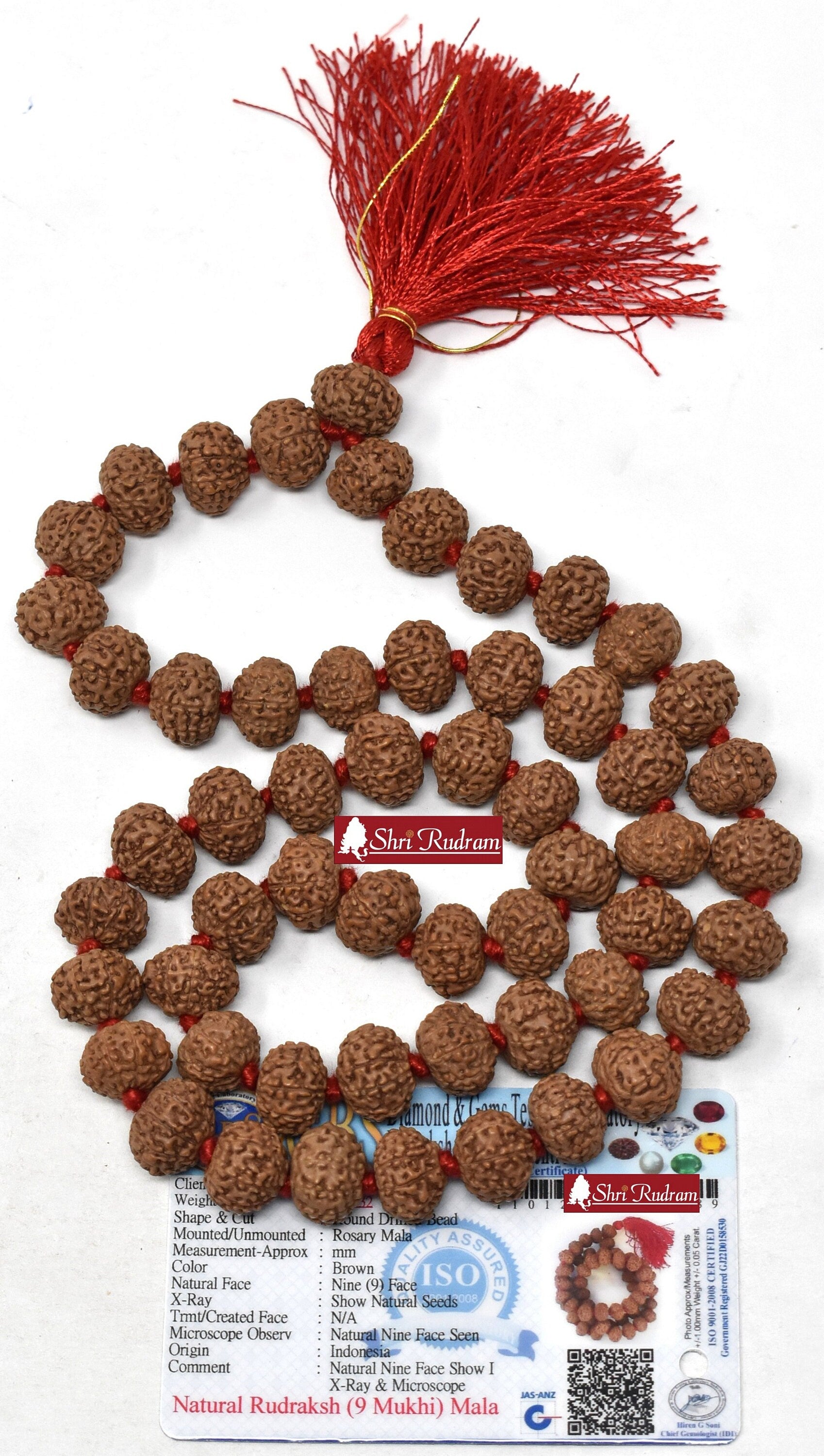 ShriRudram 9 Mukhi Rudraksha Mala / Nine Face Rudraksh Rosary 54+1 Beads Lab Certified 14-16 MM